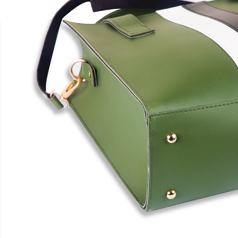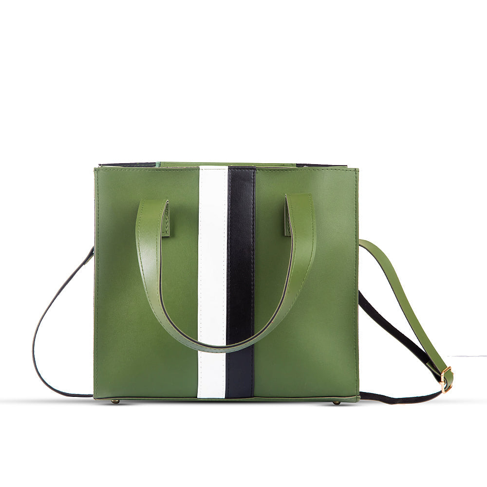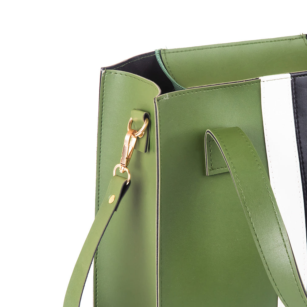 This Baku tote Shoulder Bag is made from premium vegan leather, making it a lightweight and durable accessory. The spacious main compartment has a top zipper closure to securely store your items with ease. The additional studs at the bottom of the bag provide extra protection against scratches, making it perfect for everyday use and university life. Inside the compartment with zip closure allows you to synchronize your belongings. Front contrast black and white stripe makes this trendy bag more attractive and matches with your gorgeous outfits.