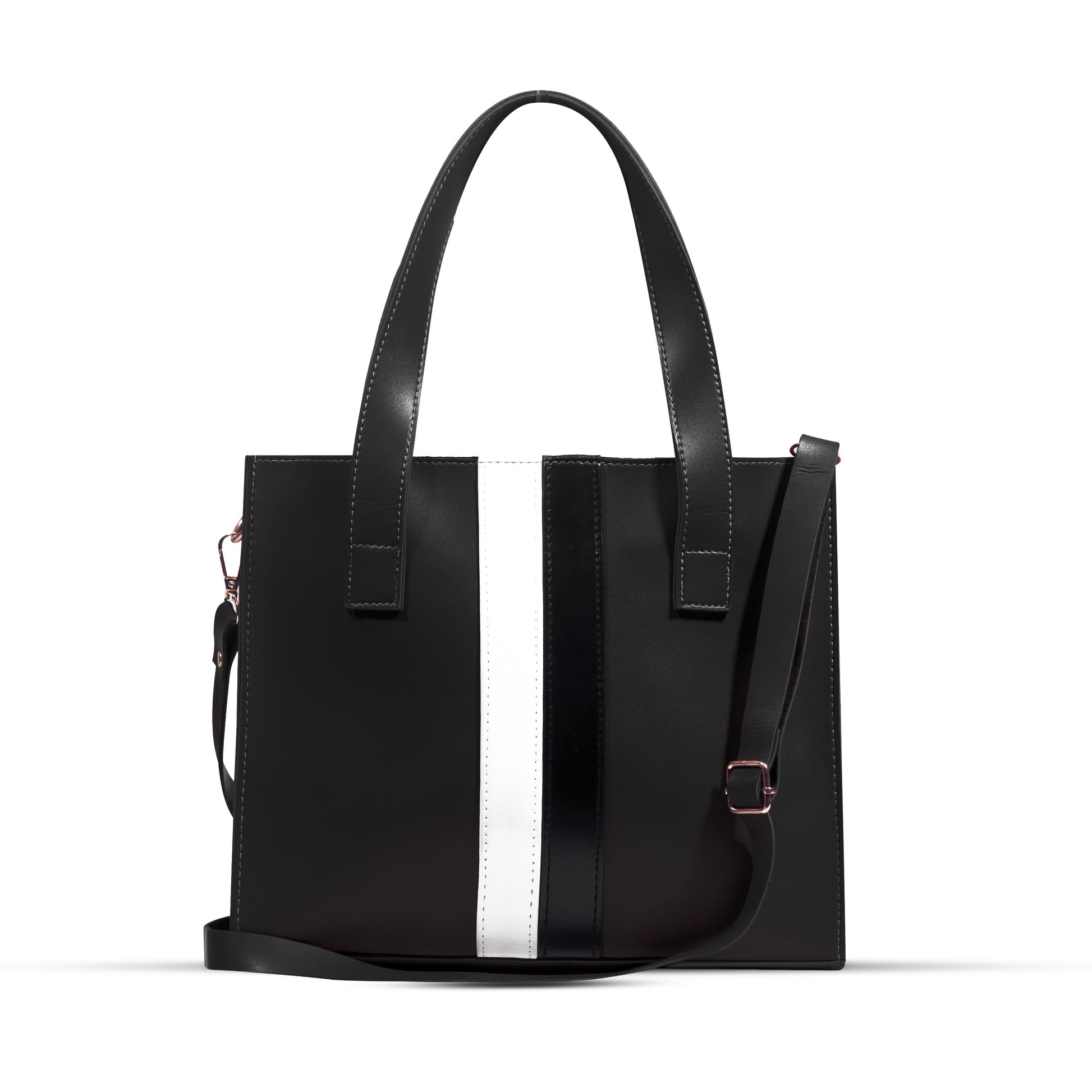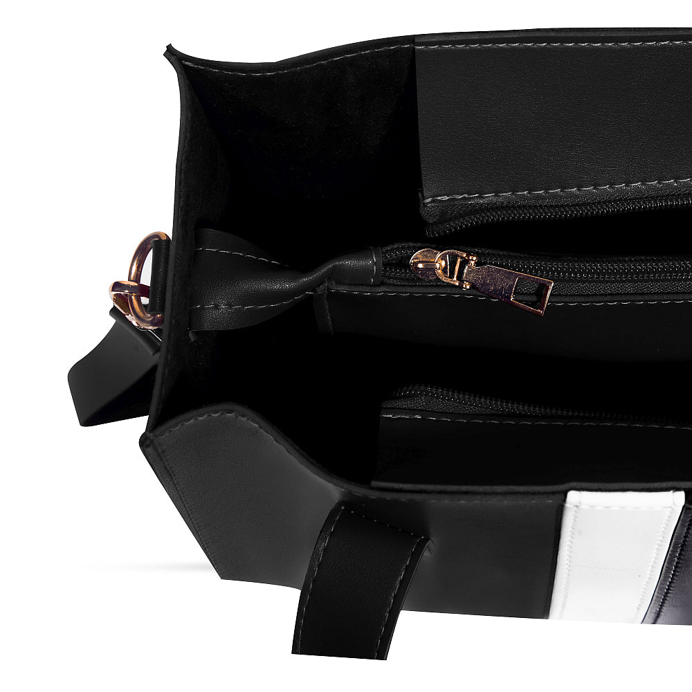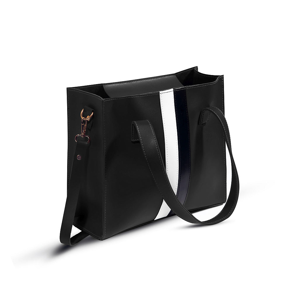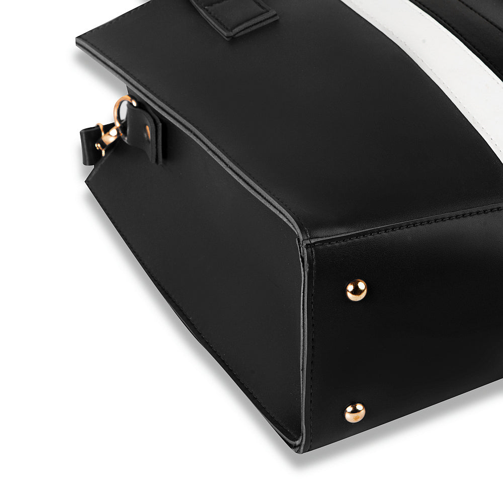 This baku tote Shoulder Bag is made from premium vegan leather, making it a lightweight and durable accessory. The spacious main compartment has a top zipper closure to securely store your items with ease. The additional studs at the bottom of the bag provide extra protection against scratches, making it perfect for everyday use and university life. Inside compartment with zip closure provides you to synchronize your belongings. Front contrast black and white stripe makes this trendy bag more attractive and matches with your gorgeous outfits.