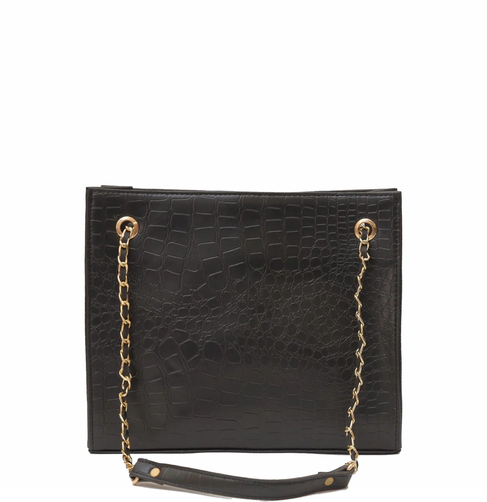 Thanks to its classic spacious size, this black crocodile handbag with a synthetic leather chain handle strap will be one you'll look forward to bringing everywhere. Plus, the top zipper and inside pockets promise ease of use. Team it with anything from eastern dresses to western looks. Order now & make your own statement.